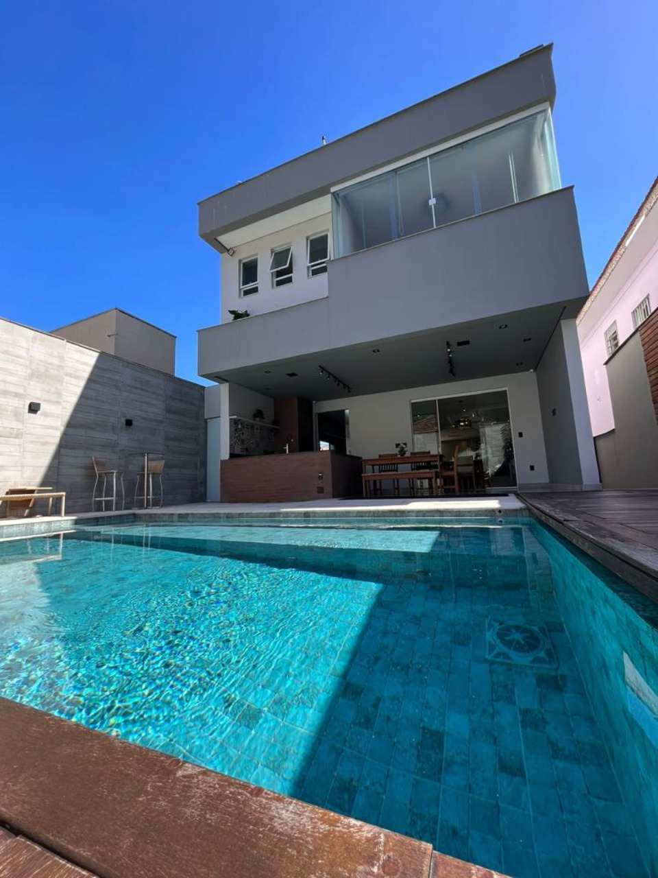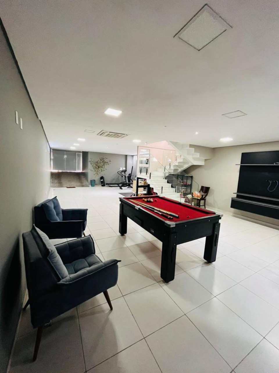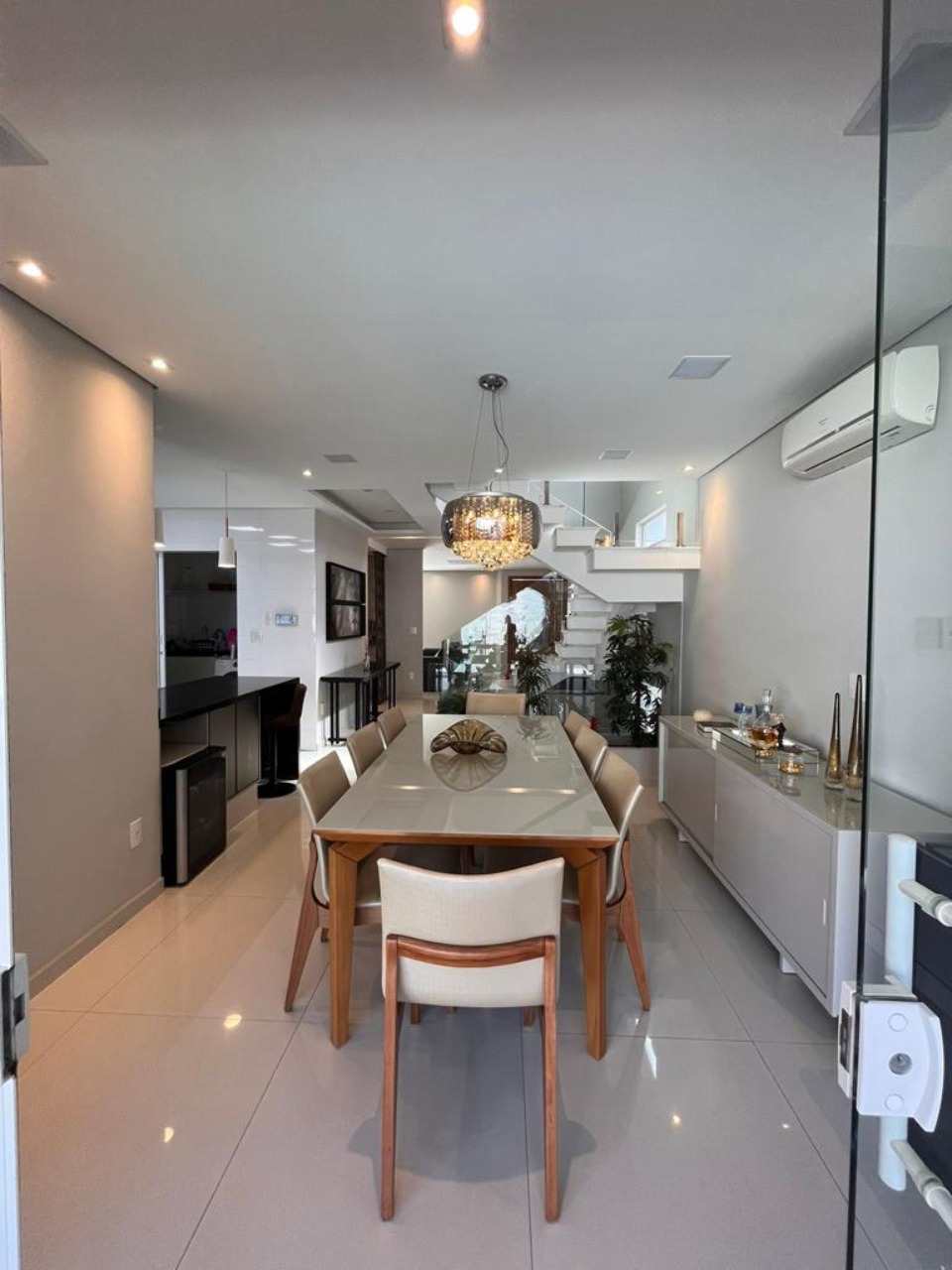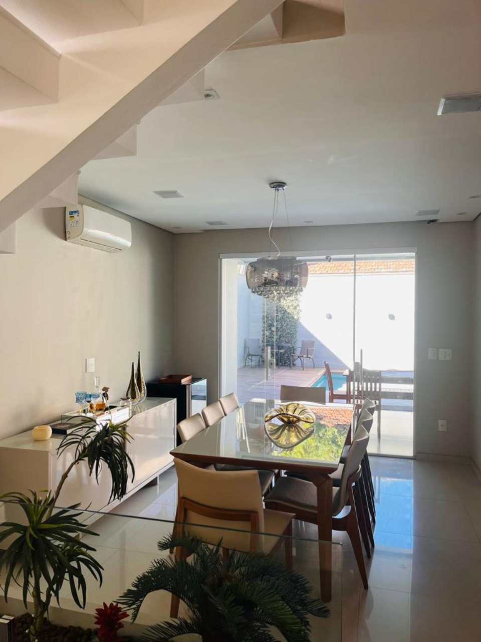 Térreo - Sala 2 ambientes com projetor sistema de som embutido, varanda, lavabo, cozinha América, espaço gourmet, piscina aquecida com Deck, com sistema de cobertura automática e sistema de sal