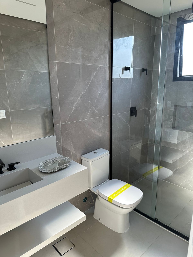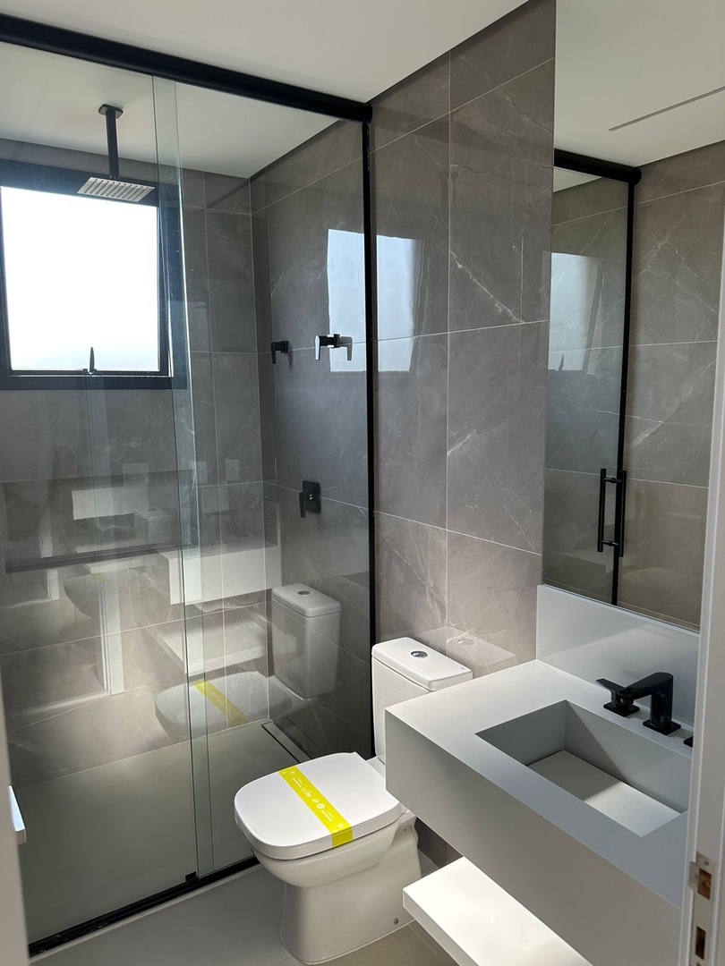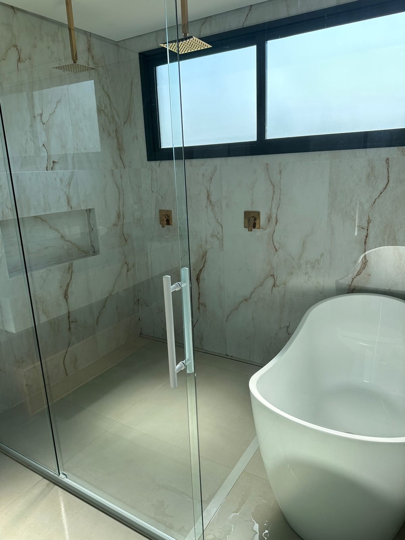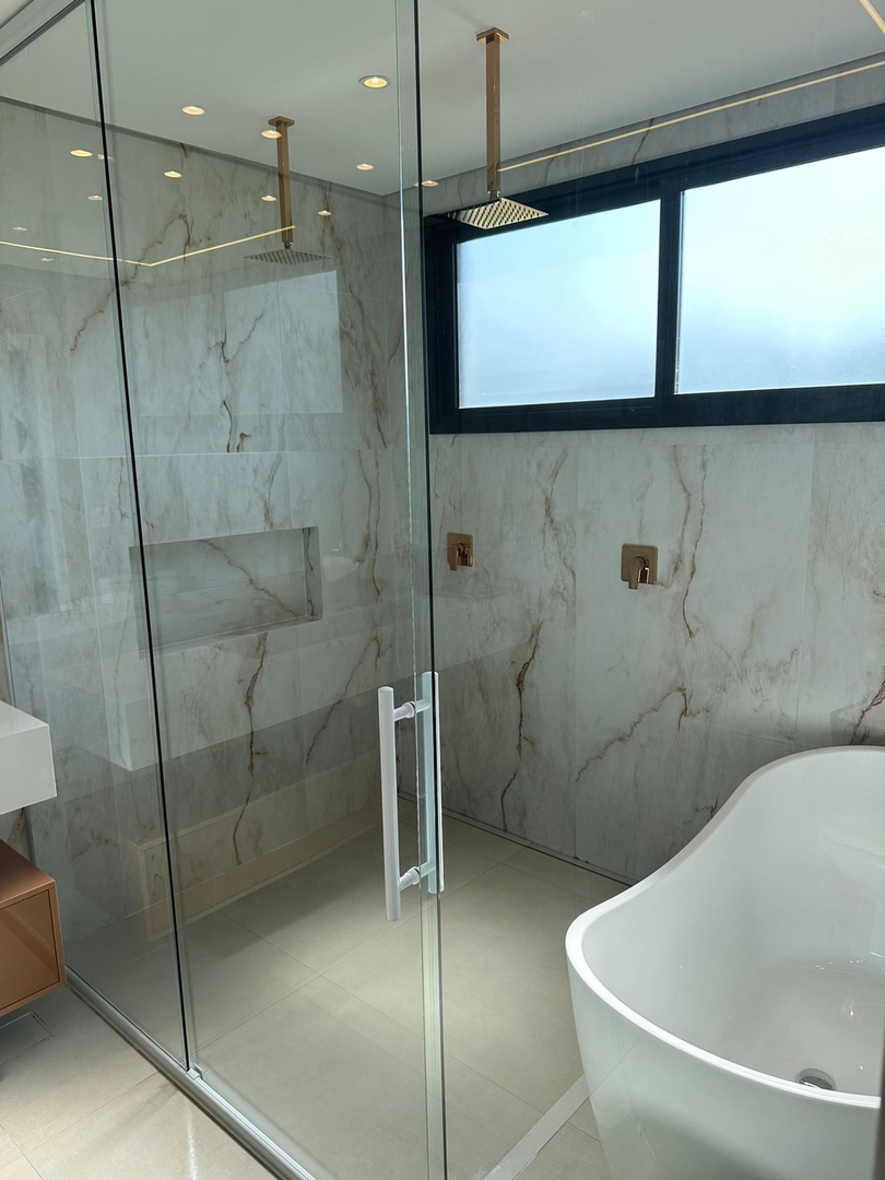 - Box de vidro temperado, nos banheiros das suites, até o teto;