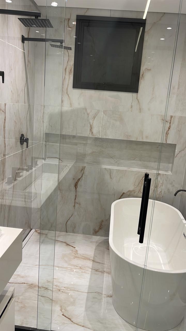- Box de vidro temperado, nos banheiros das suites, até o teto;