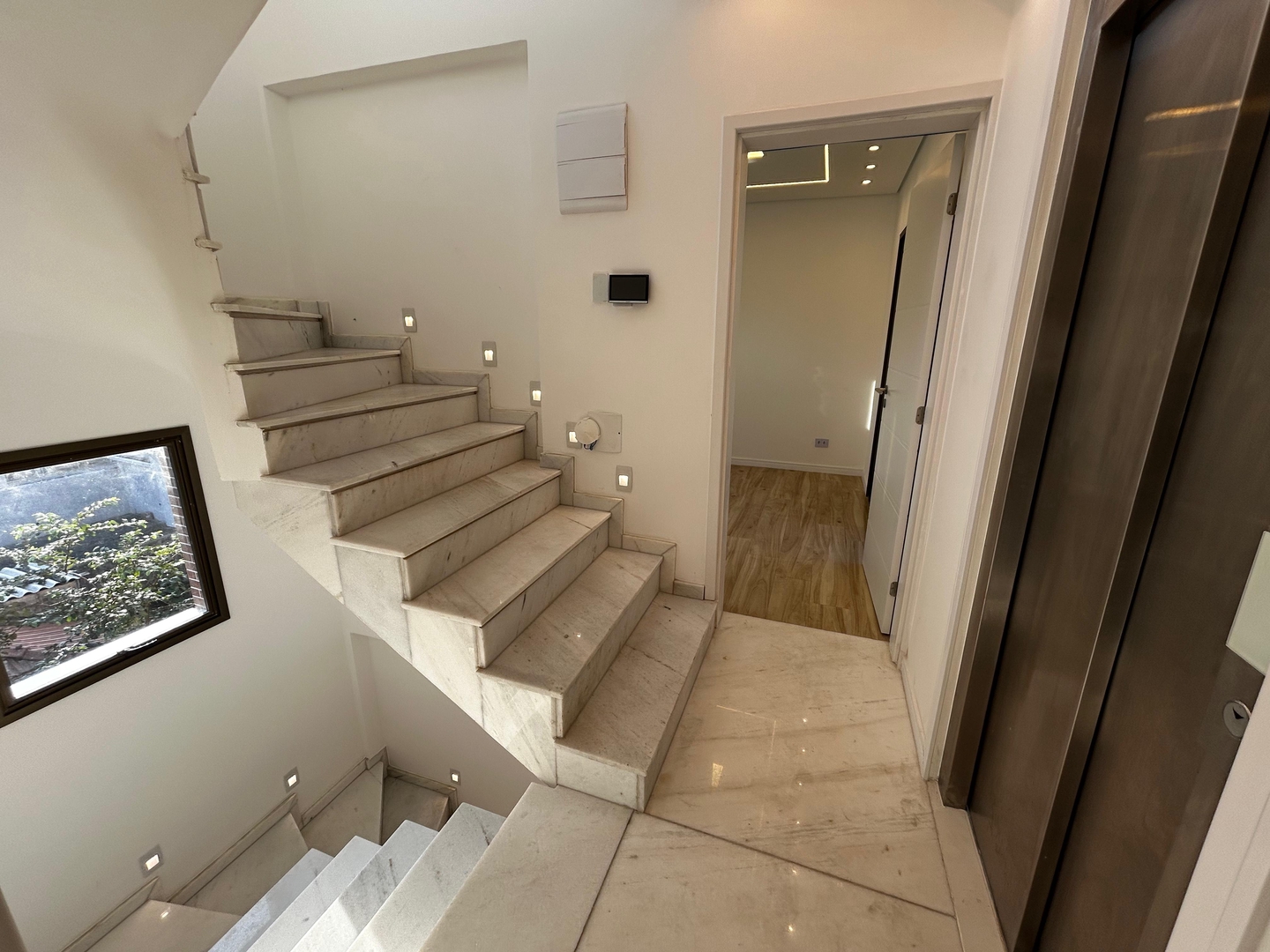 Elevador panorâmico inteligente que serve todos os andares, parando somente no que os donos da casa permitirem.