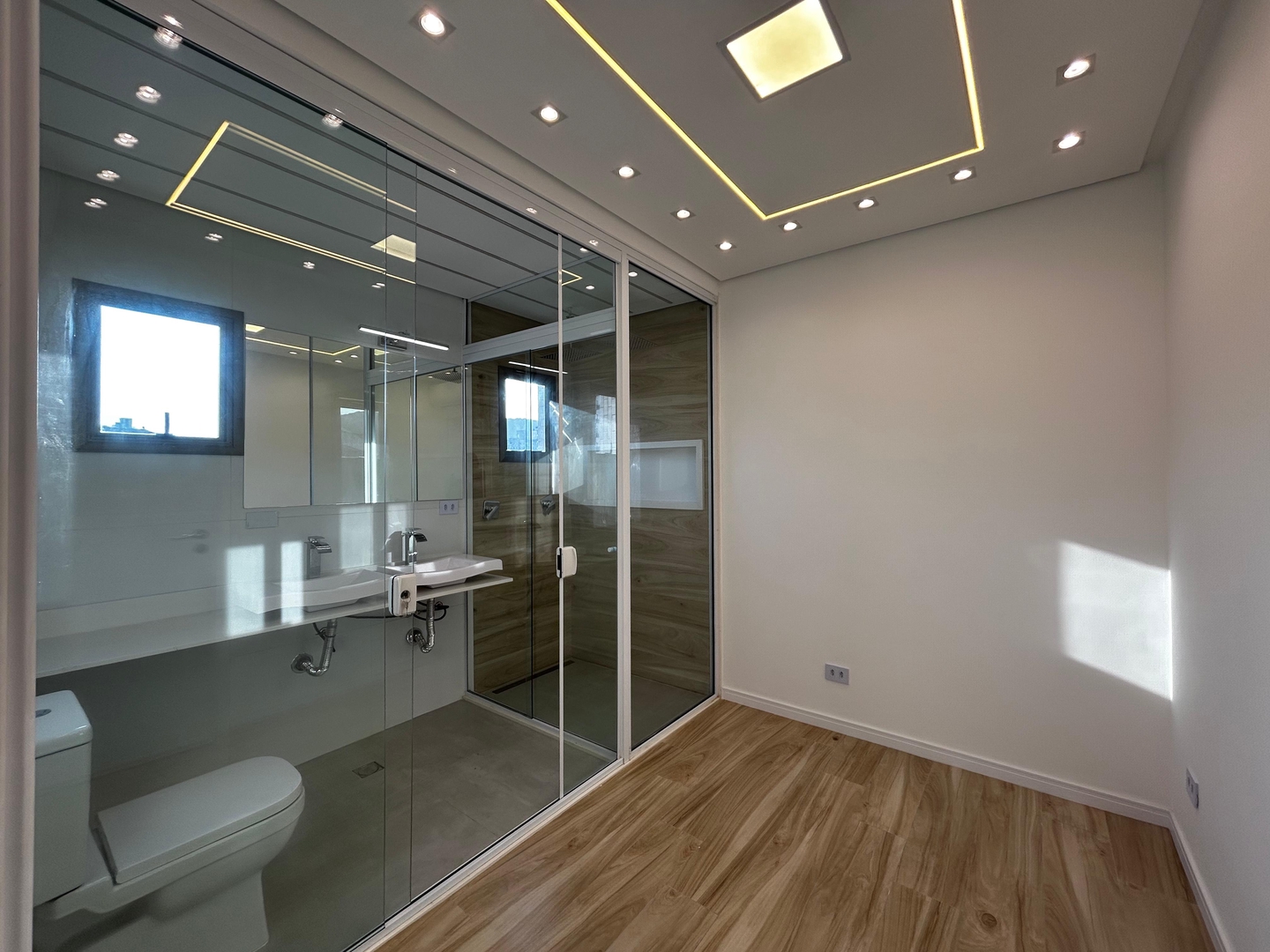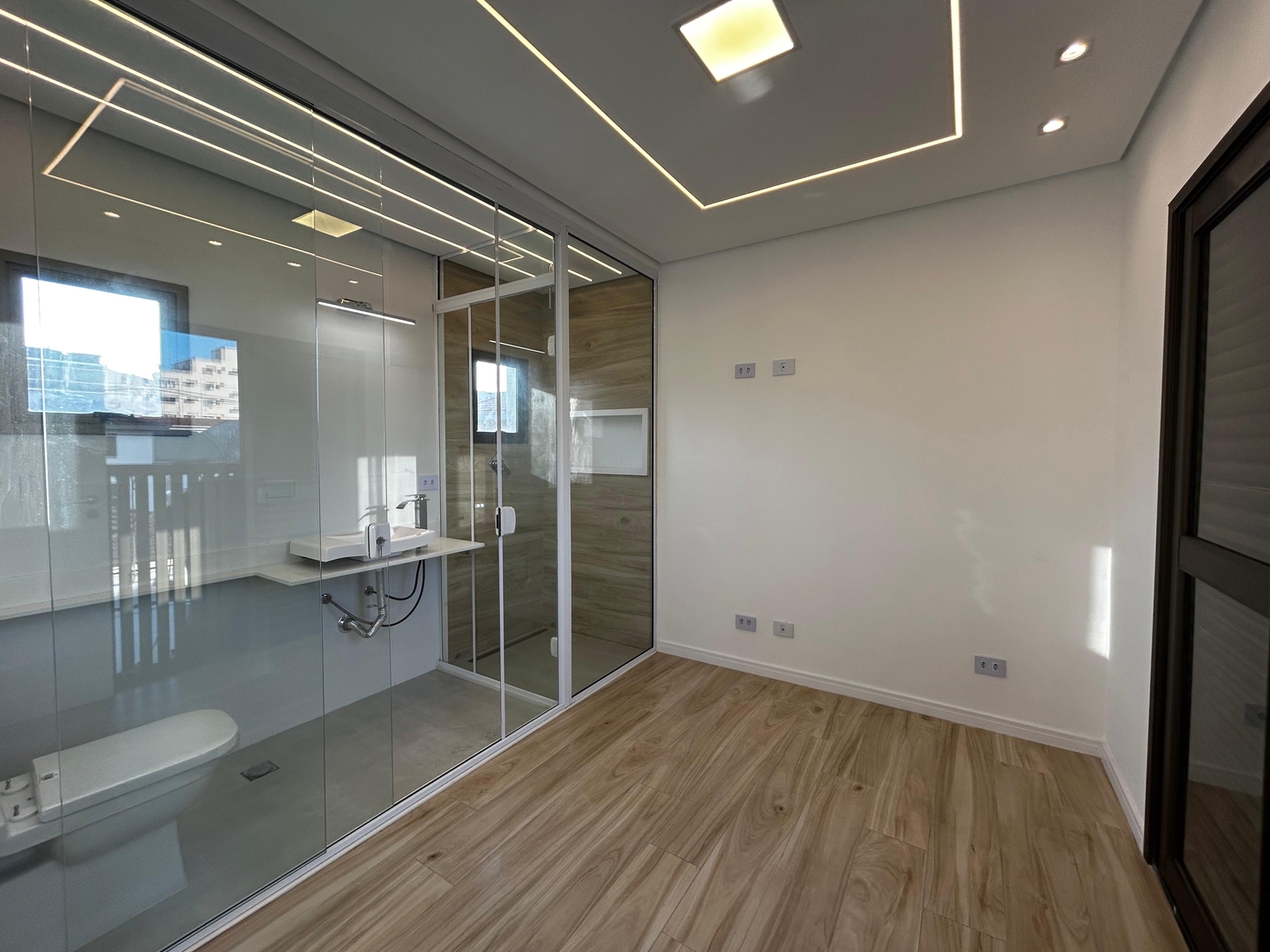 1 suíte master com ar condicionado com 2 chuveiros e 2 pias lavatório