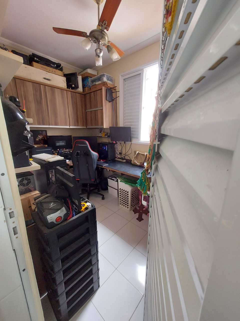 Garagem com portão eletrônico, uma vaga para carro e uma para moto separadas por portão e um quarto de despensa.